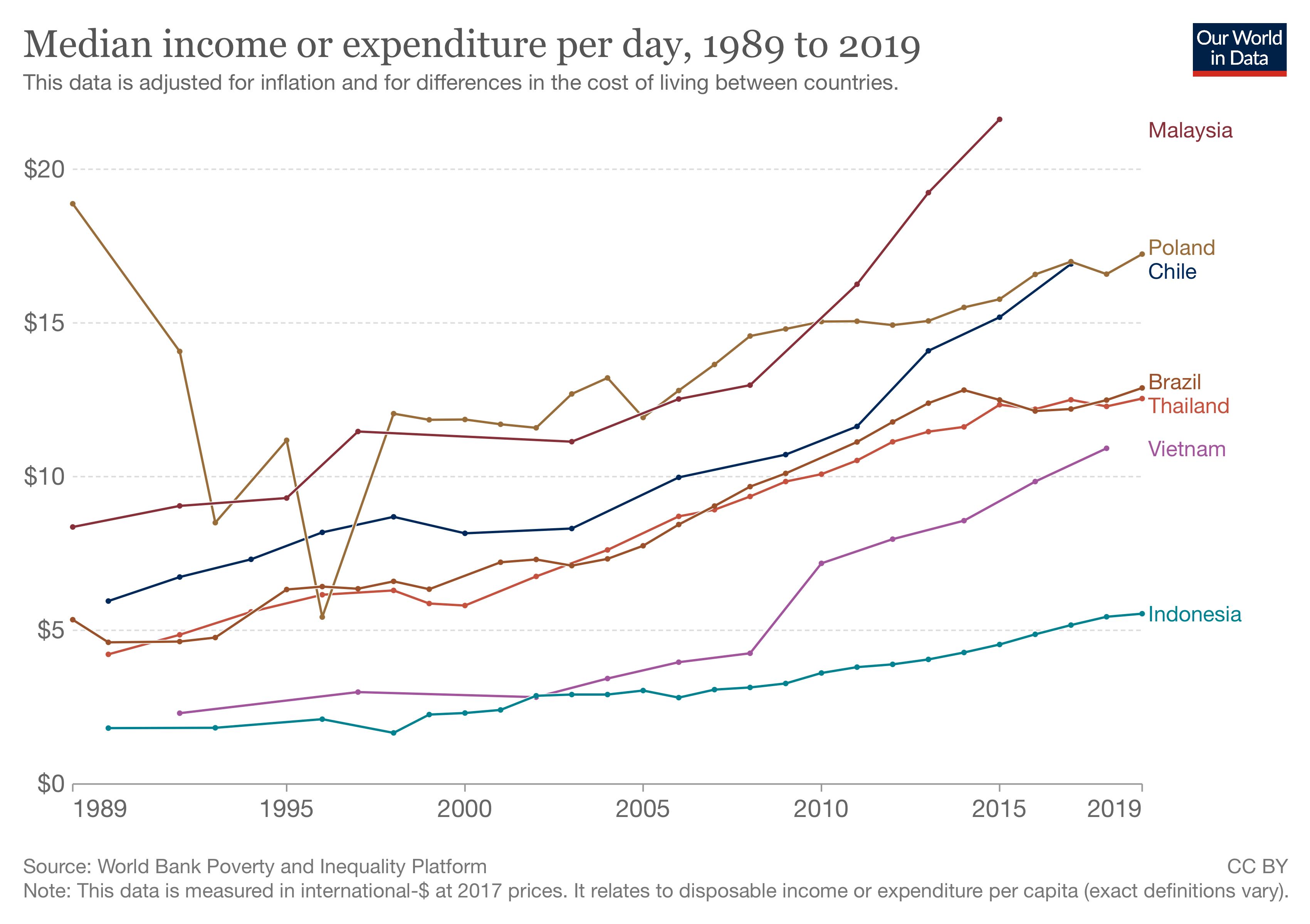 And at the median, things were even better: the median Vietnamese person experienced a quintupling of their consumption, from USD 2.31 to USD 10.92. For Malysia, the median person’s daily consumption nearly tripled (from USD 8.36 to USD 21.62). The story is much the same across all these countries, with the interesting exception of Poland, where the collapse of communism seems to have hurt the poor in the early 1990s, but subsequent growth has made up the lost ground.